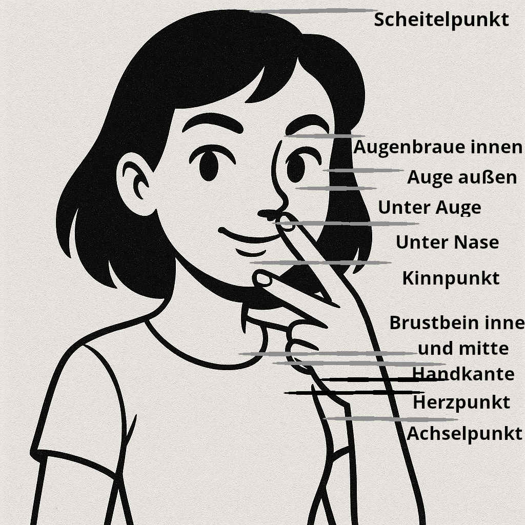 Die anderen Punkte von dem Augenbrauenpunkt begonnen, klopfen Sie nun ebenfalls je 10-15 mal durch, immer mit der Erinnerung und den entsprechenden Gefühlen die zu der schmerzlichen Erfahrung gehören.